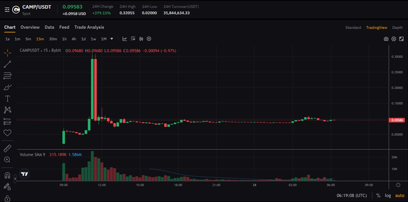 据市场数据,CAMP代币开盘价为0.02 USDT,最高一度涨至0.32 USDT,相较开盘价涨幅超过1500%。按最高价计算,FDV一度突破32亿美元。目前价格约0.096 USDT。
