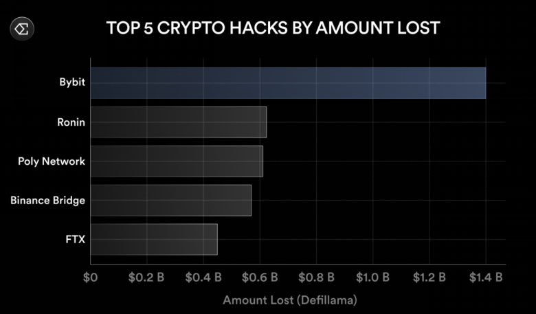 根据DeFiLlama统计,此次Bybit损失的金额是迄今为止最大的加密货币盗窃案,超越了此前Ronin Network和Poly Network的黑客事件,后两者分别损失6.24亿美元和6.11亿美元。