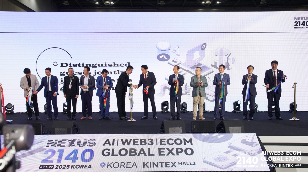 在现场热烈的掌声中,NEXUS 2140 全球博览会剪彩仪式正式举行。来自韩国政府、京畿道道厅、越南和泰国等政府机构的嘉宾代表,与大会主席 Fardi Wang 及多家协办机构负责人一同登台,共同完成本次盛会剪彩仪式。